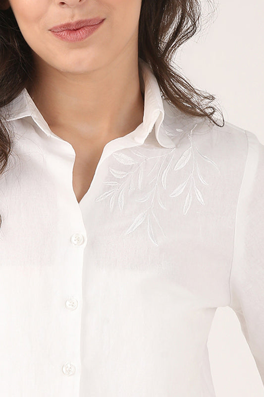 White Linen Shirt with tone on tone Shoulder Embroidery