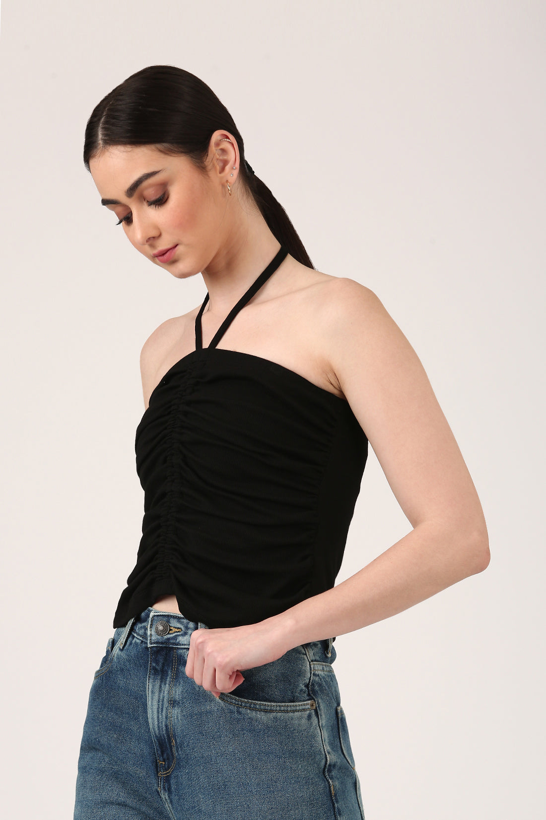 Black Ruched Halter Neck Top For Women – Strap Detail Fitted Party Crop