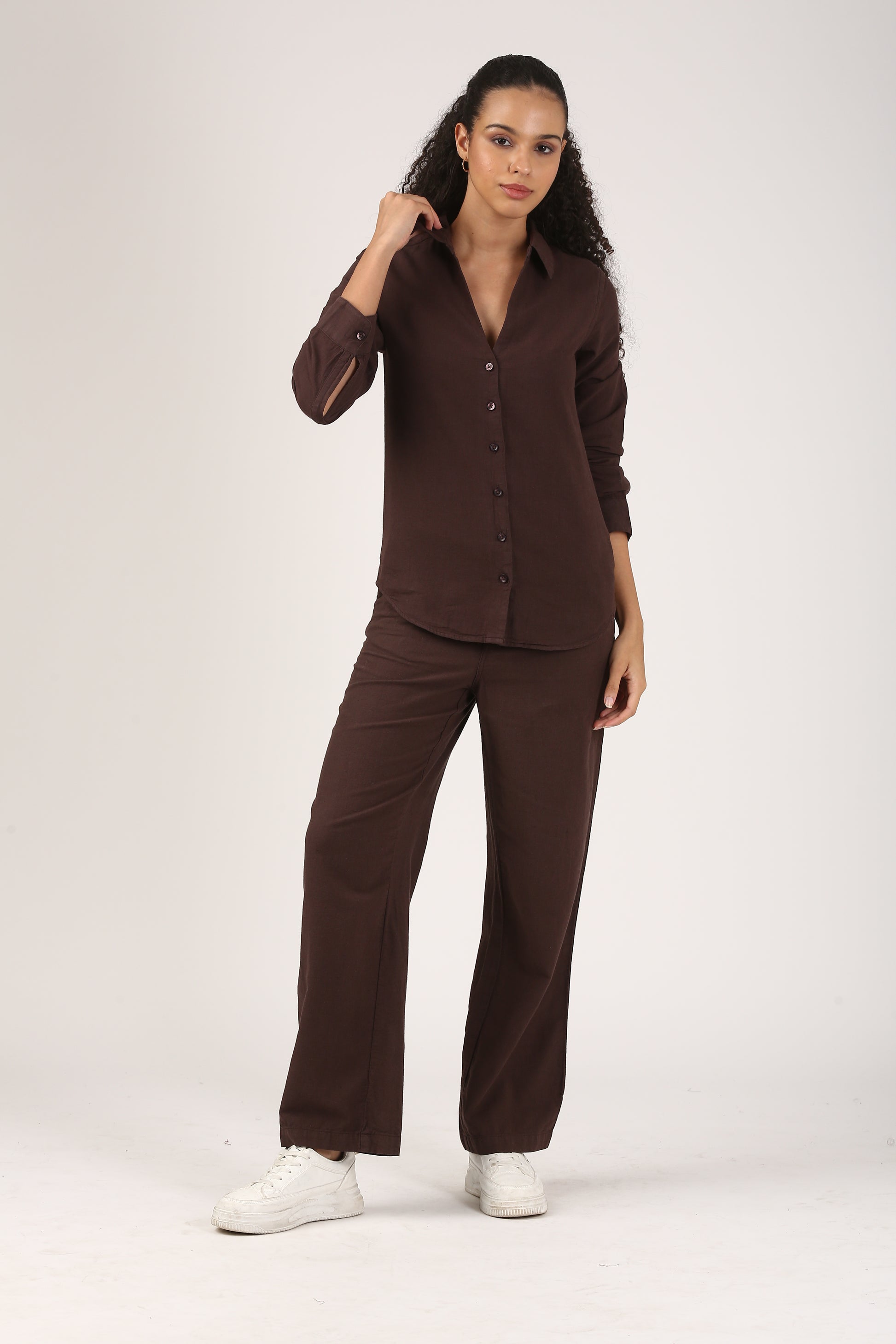 Add timeless versatility to your wardrobe with the Chocolate Brown Cotton-Linen Wide-Leg Pants. Crafted from a premium blend of 70% cotton and 30% linen, they offer breathable comfort and absorbency, ideal for warm weather. Designed with a relaxed fit, elastic waistband, and side pockets, these pants balance functionality with understated elegance. Style them solo with a neutral top or pair them with the matching Chocolate Brown Classic Shirt for a coordinated cotton-linen coord set that transitions seamlessly from day to evening.