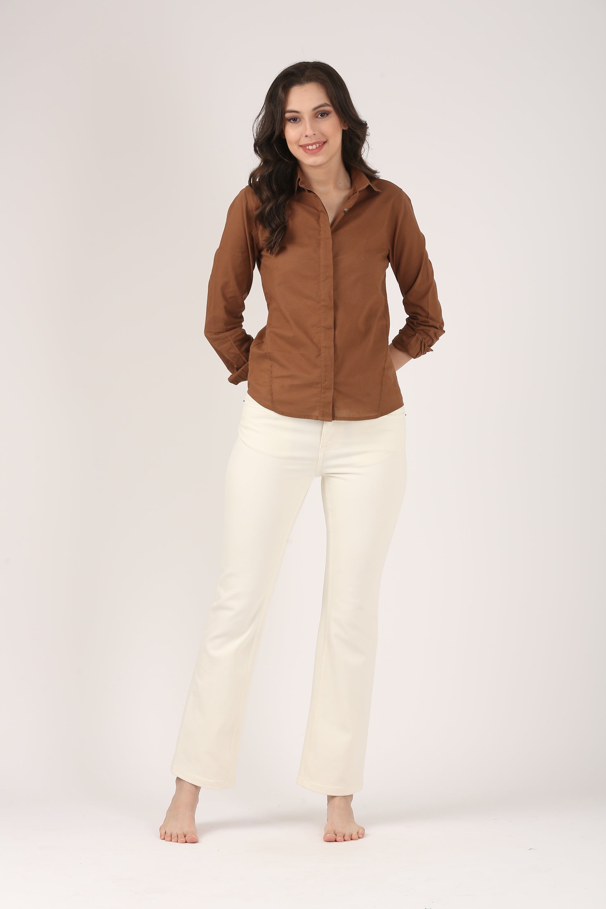 Elevate your workwear with the Coffee Brown Cotton Pintuck Shirt, a sophisticated essential tailored for structure and style. Made from 100% pure cotton with a soft hand feel, it features pintuck detailing and a hidden placket for a clean, refined finish. Designed with a slim fit, full sleeves, notch collar, and curved hem, it delivers a flattering silhouette that’s ideal for both office wear and smart-casual dressing. Pair it with tailored trousers or skirts for a professional look, or style it with denim for a modern weekend edge.