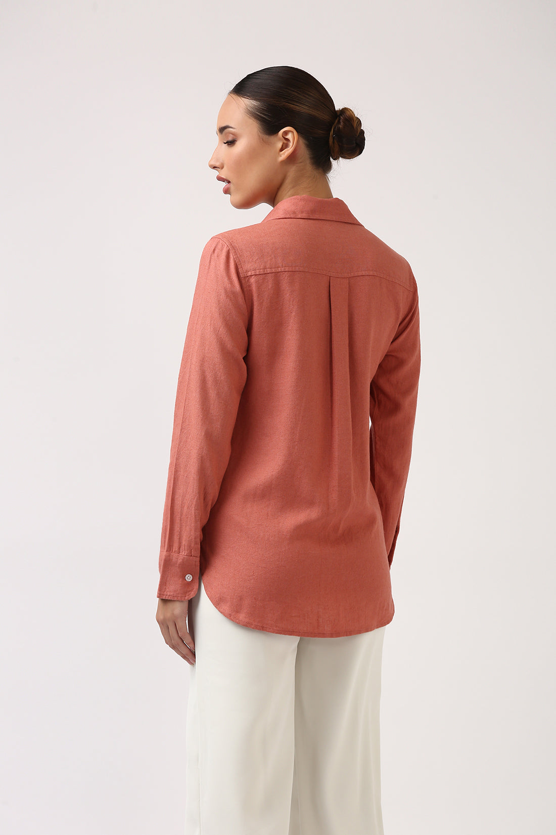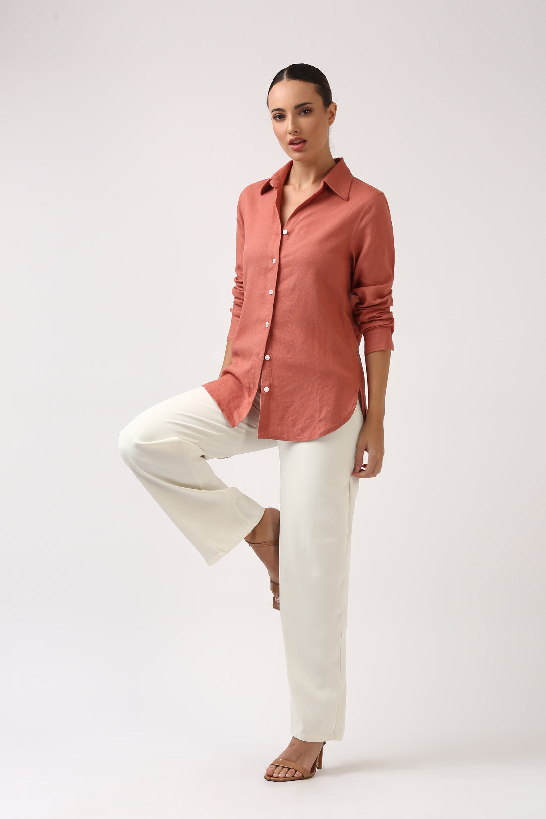 A soft coral linen shirt in signature Jolene quality designed to complement your favorite denims and white or off-white bottoms