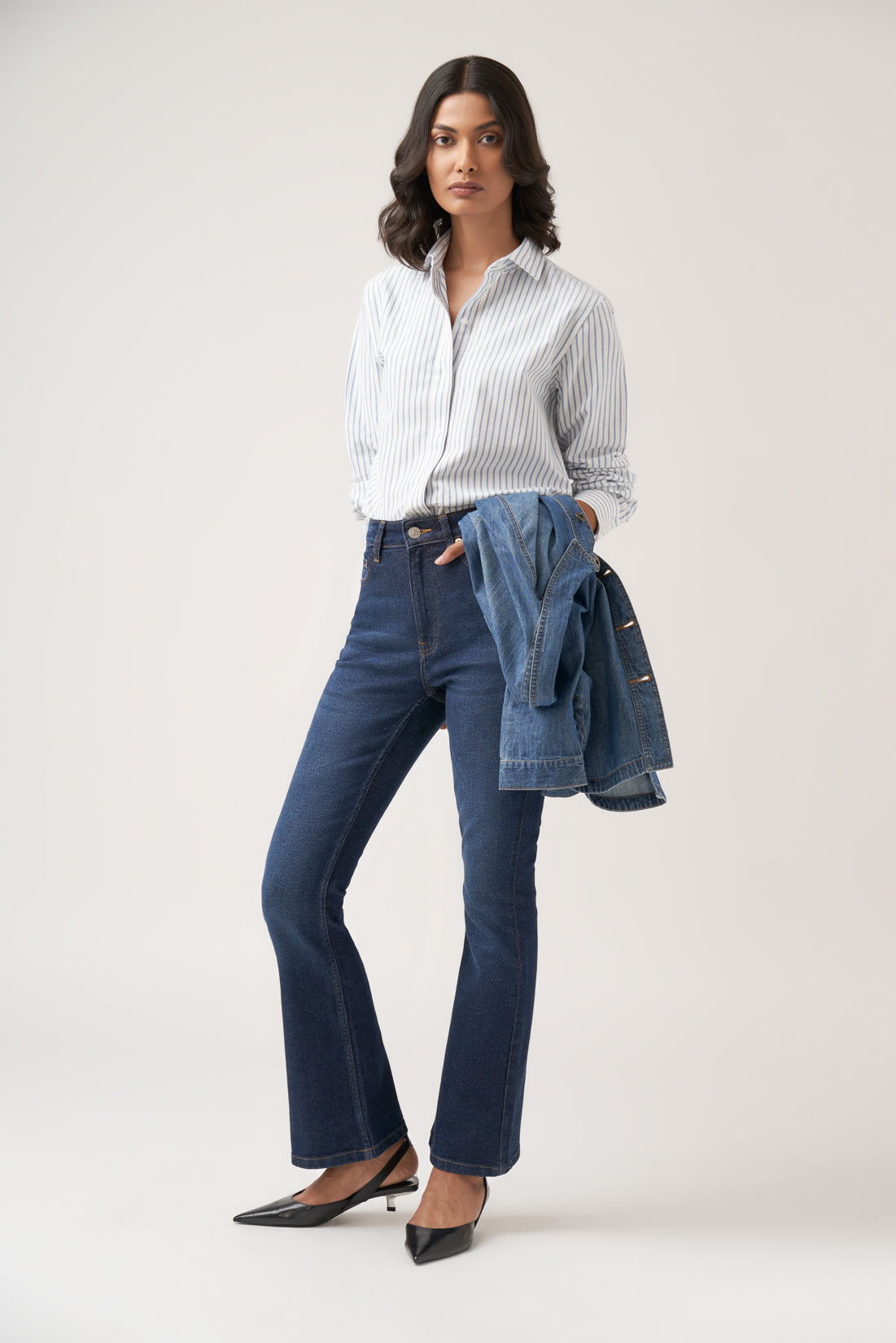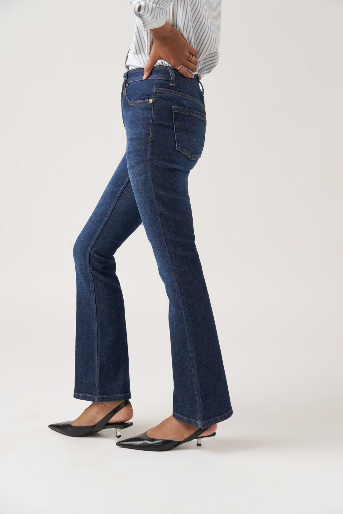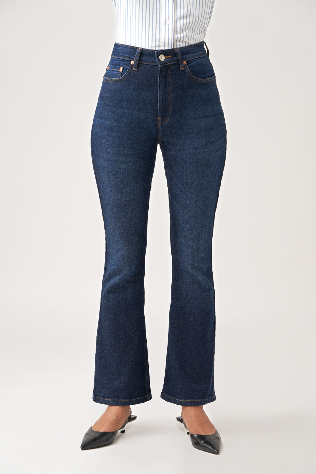 Retro-inspired in a midnight-blue wash with mini flare, these denim pants are a real head-turner.
