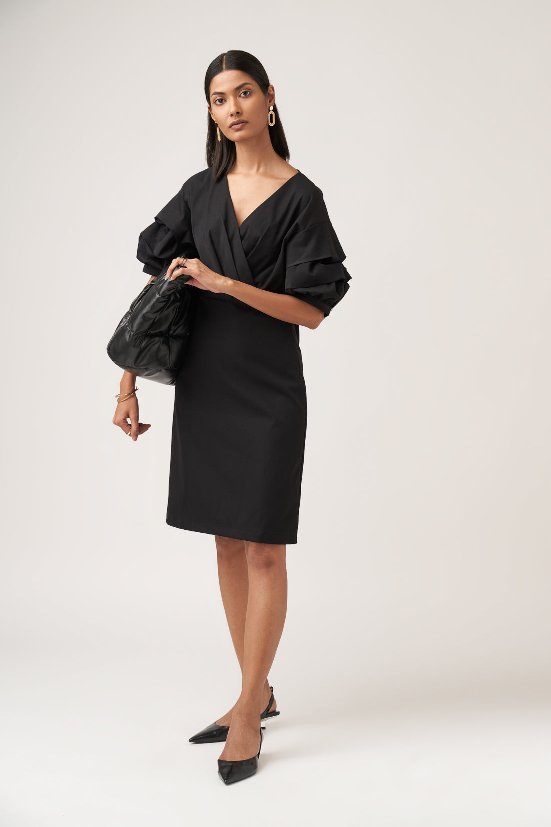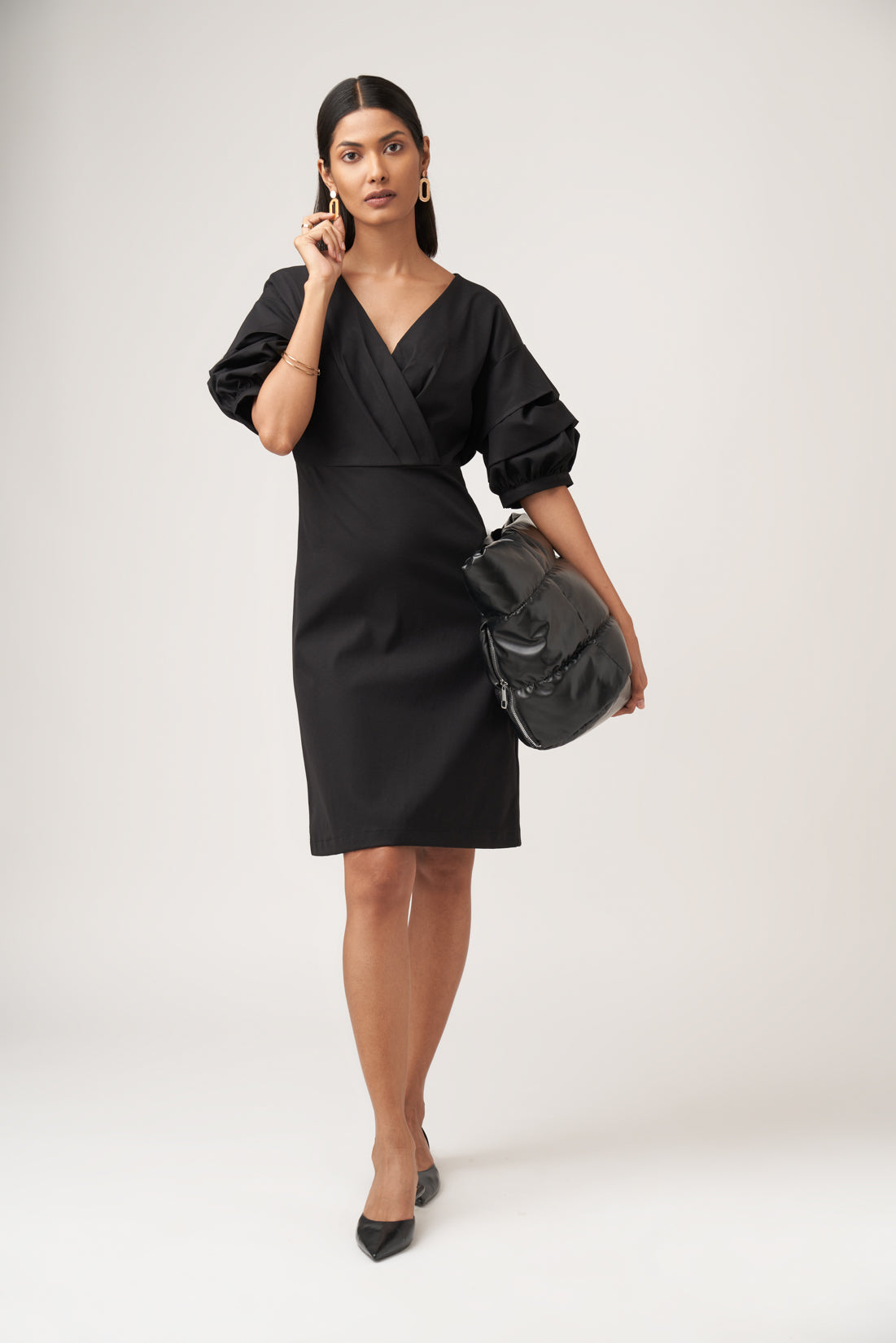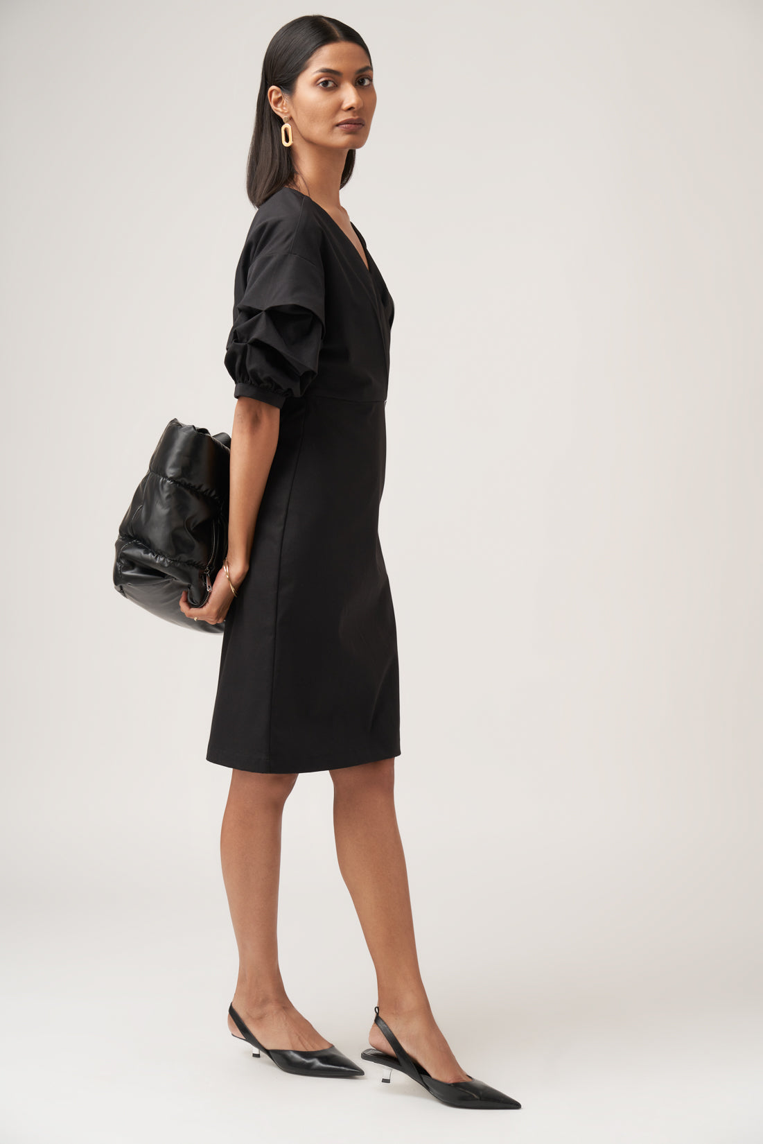 Overlapping V neck dress with artful ruched sleeves for a dapper, textured appeal.