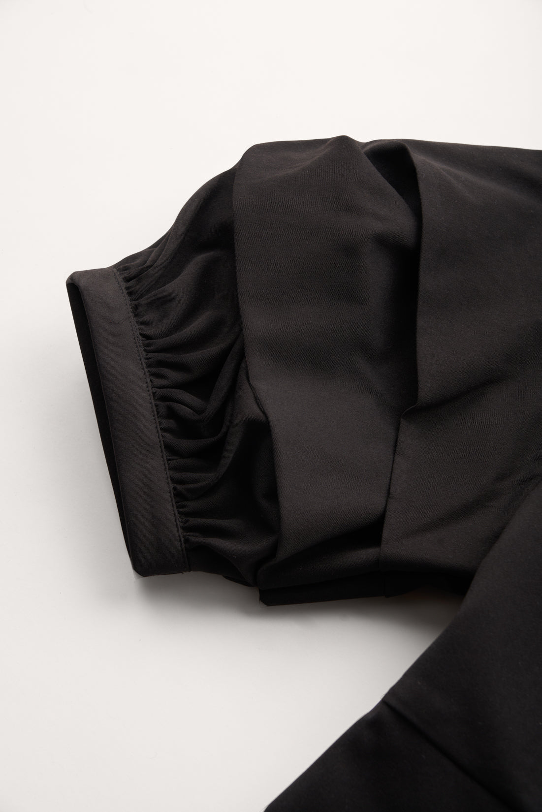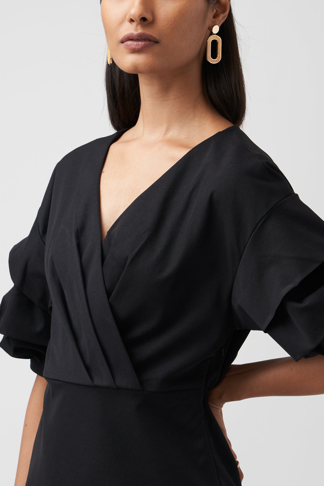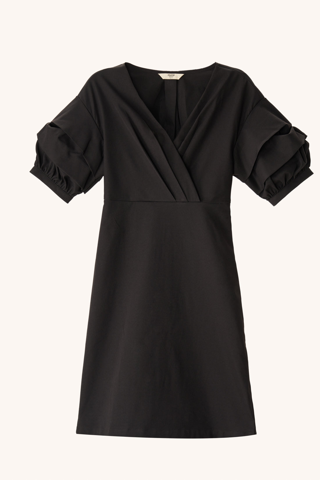 Overlapping V neck dress with artful ruched sleeves for a dapper, textured appeal.