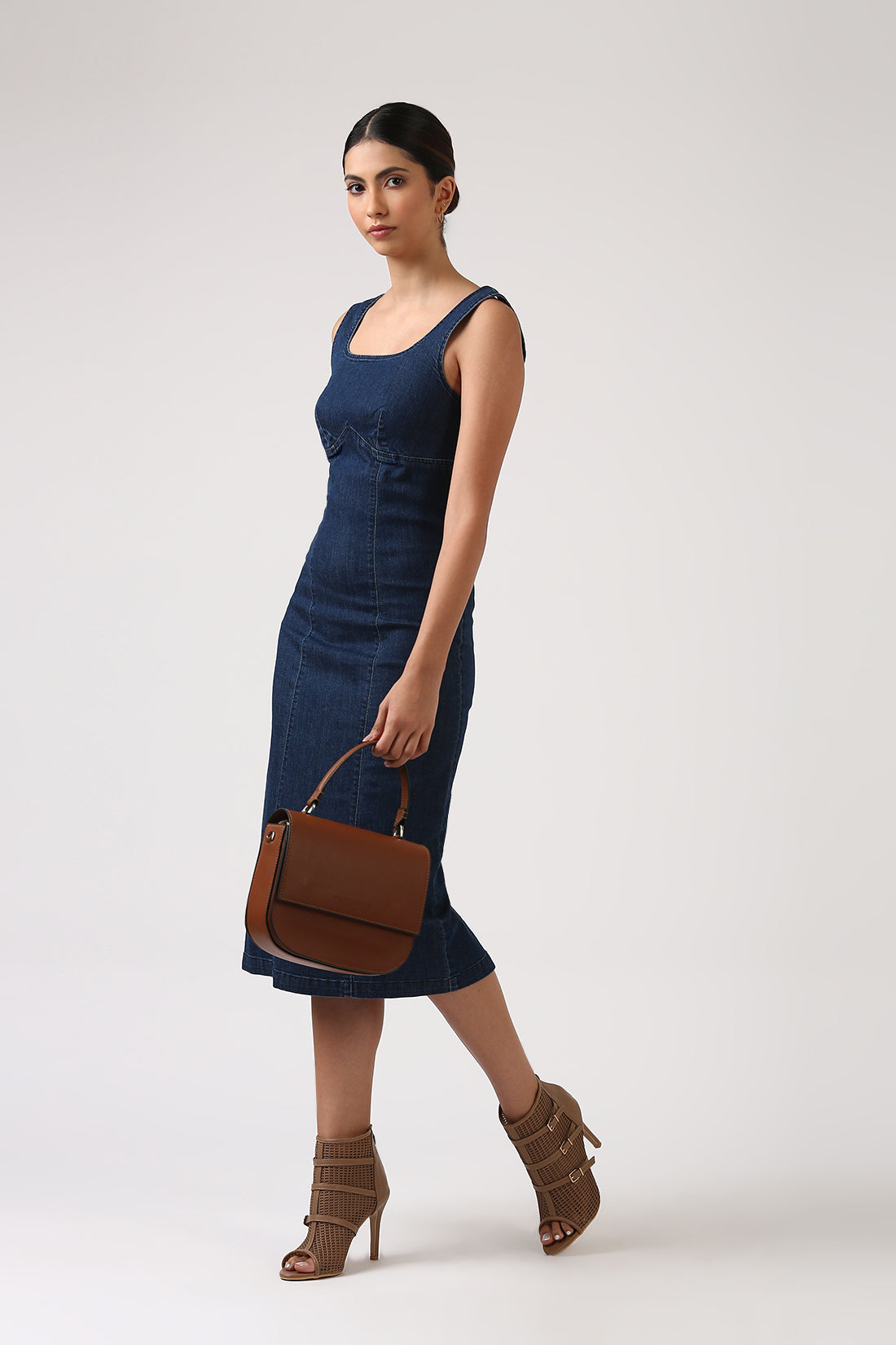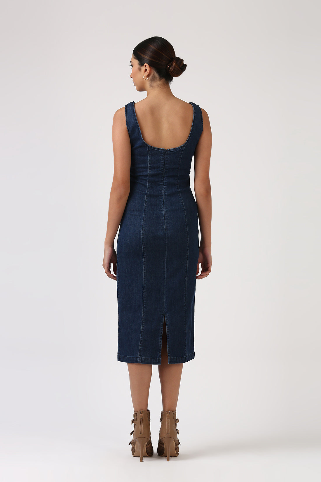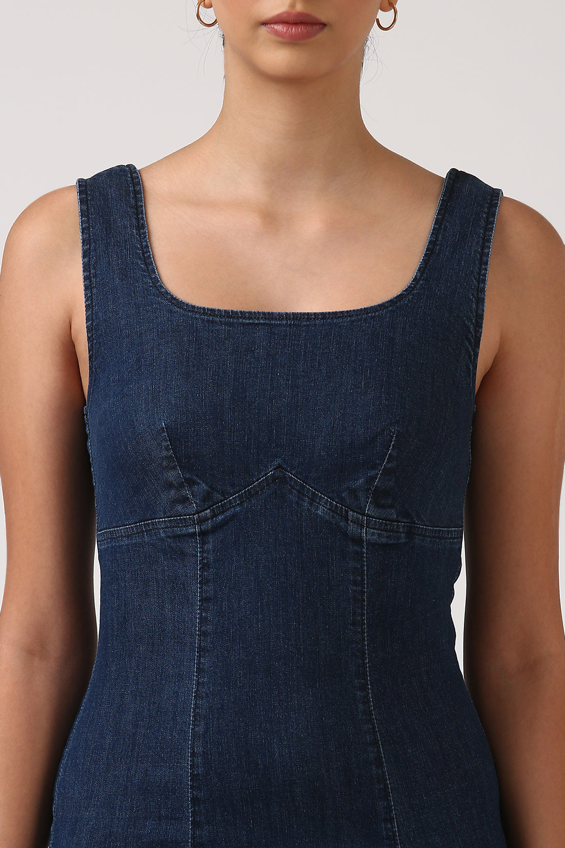 Denim dress featuring broad straps and a sleek square neckline. With its versatile mid-length design, this piece strikes the perfect balance between laid-back cool and refined style.