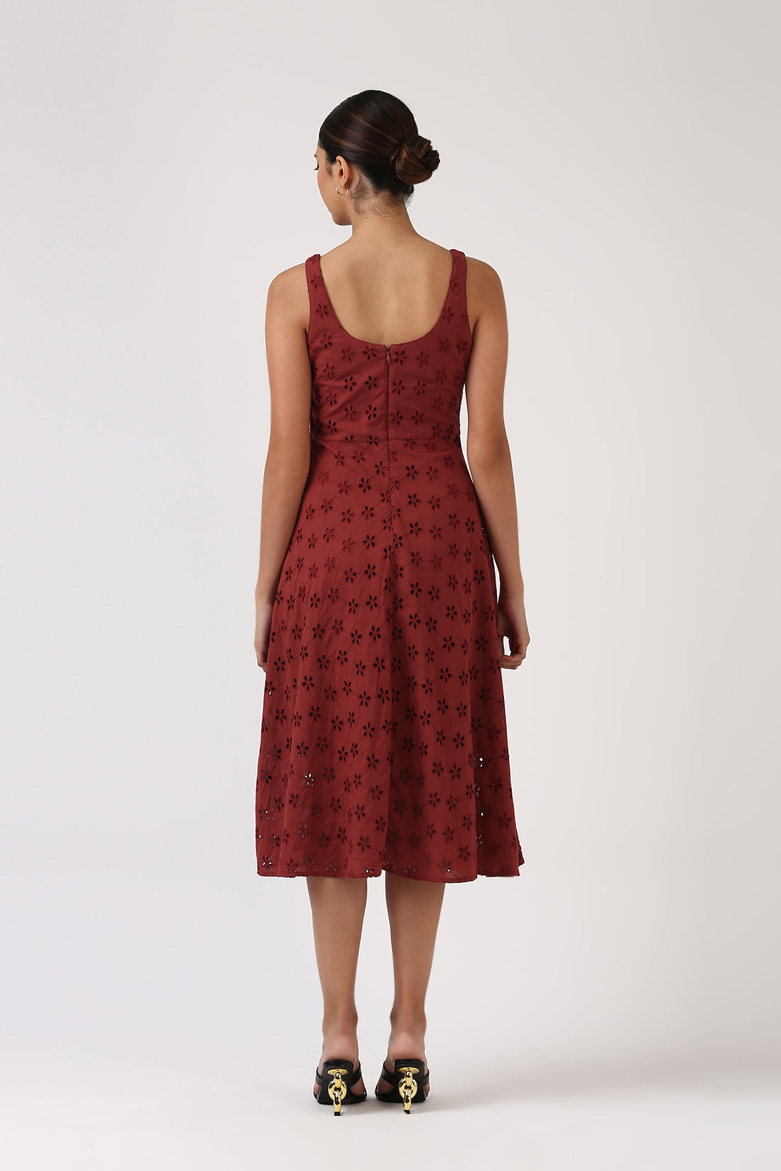 Bask in timeless grace with this rust-hued fit-and-flare dress, spun from exquisite schiffli fabric. Whether commanding attention at work or turning heads at a soirée, it dances effortlessly between sophistication and spirited charm.