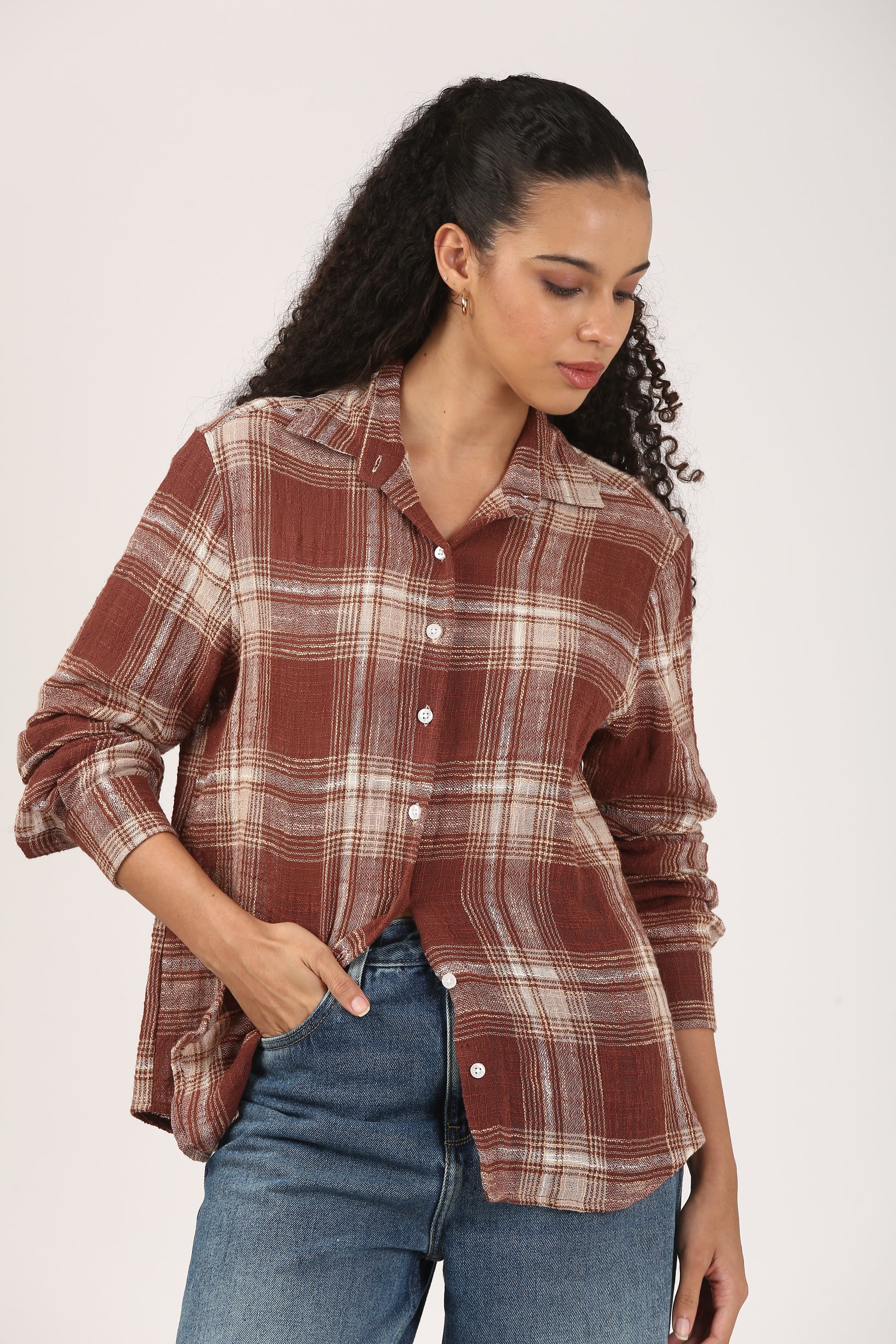 Run your hand across the fabric — you’ll feel the depth of a pattern that lives in the weave, not on the surface. That’s the quiet luxury of yarndyed cotton. This women’s yarndyed cotton shirt is crafted from threads dyed before weaving, ensuring that it stays rich, vibrant, and durable wash after wash. Designed in a classic button-down silhouette with a collared neckline and long sleeves, it’s endlessly versatile — tuck it into tailored pants for work, style with denim shorts on holiday, or wear open as a lightweight overshirt. A timeless cotton check shirt reimagined for every setting.