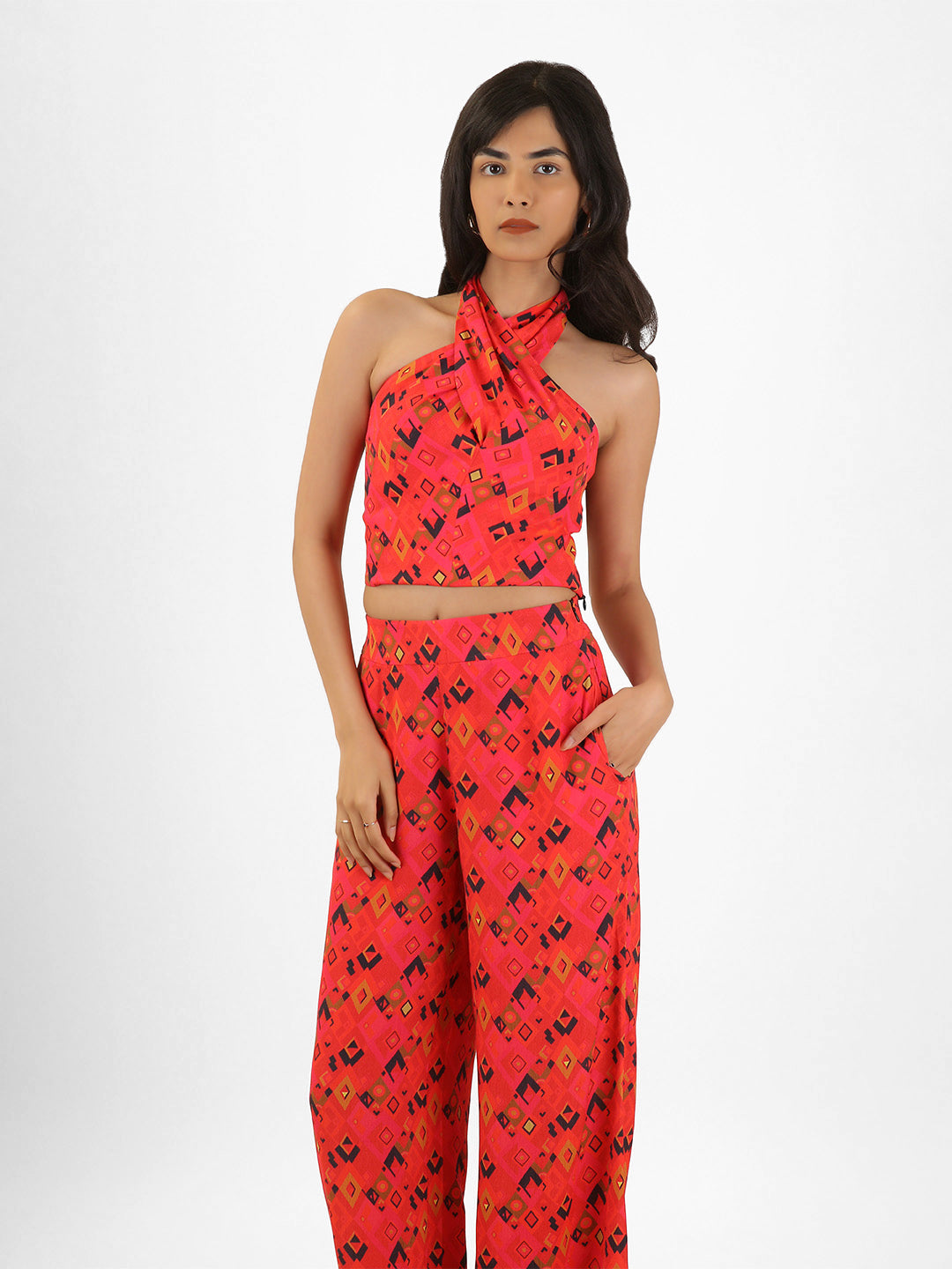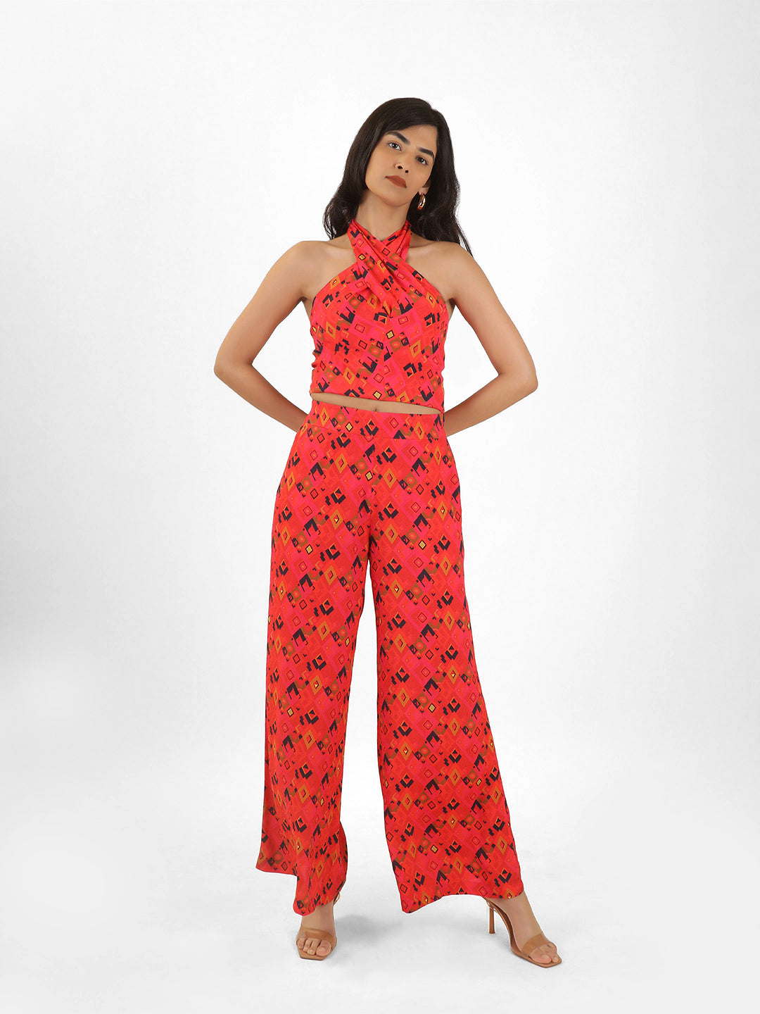 Woven from the luxuriously expensive Moroccan crepe fabric, this printed halter neck top sets a new standard for sophistication and glamour