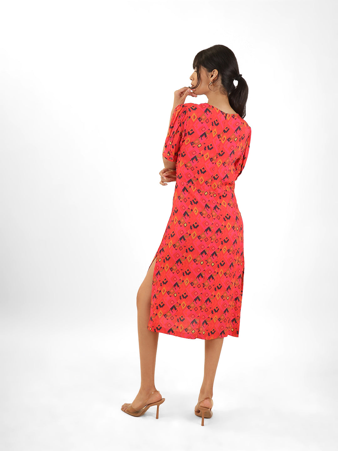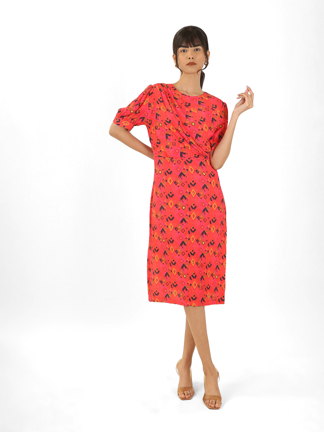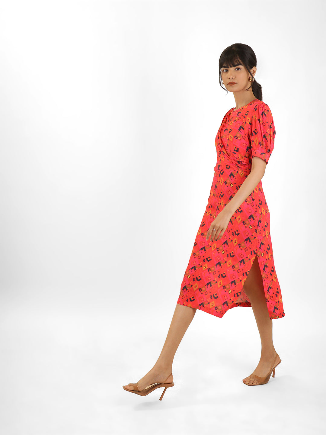 Woven from the luxuriously expensive Moroccan crepe fabric, this printed ruched midi dress sets a new standard for sophistication and glamour