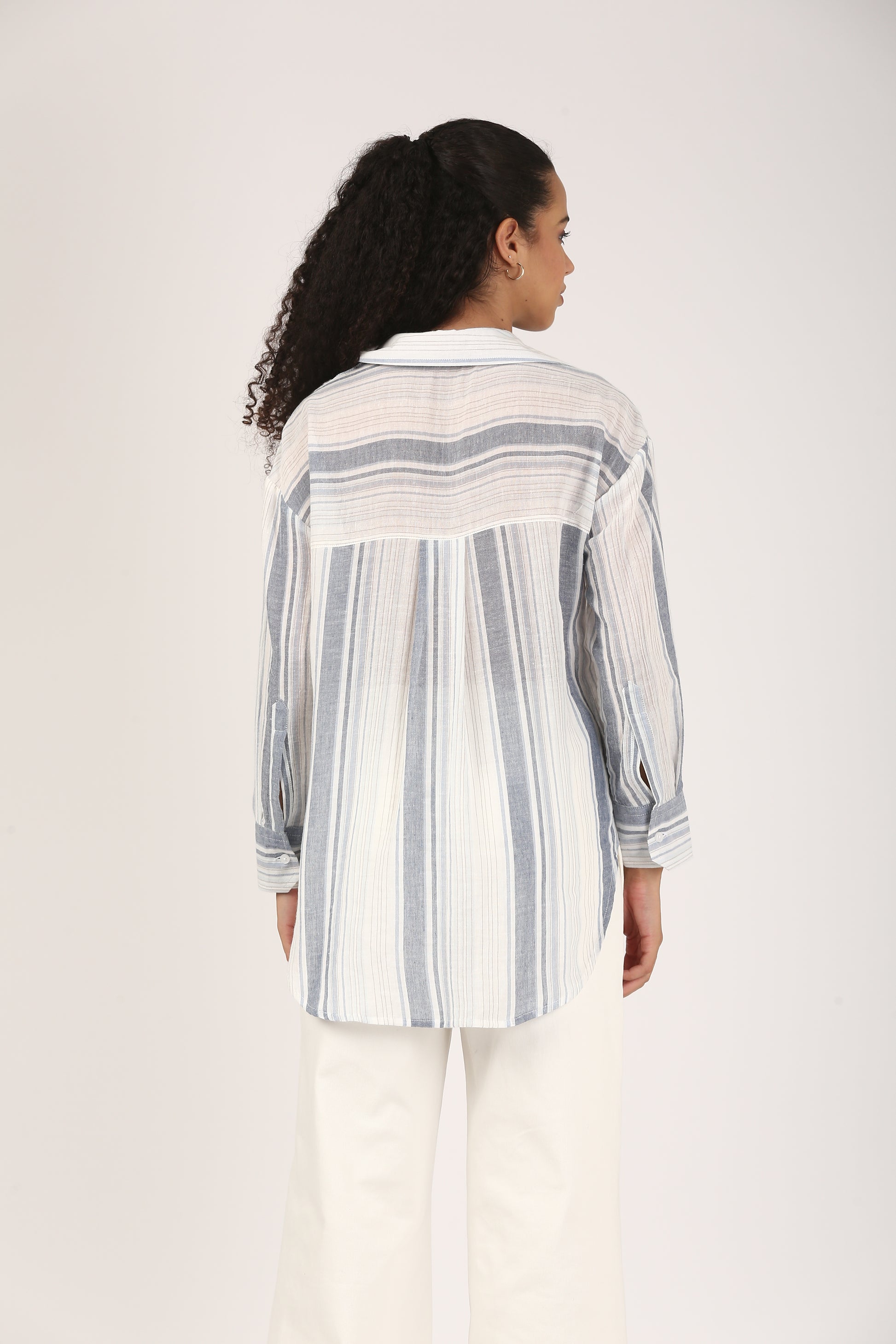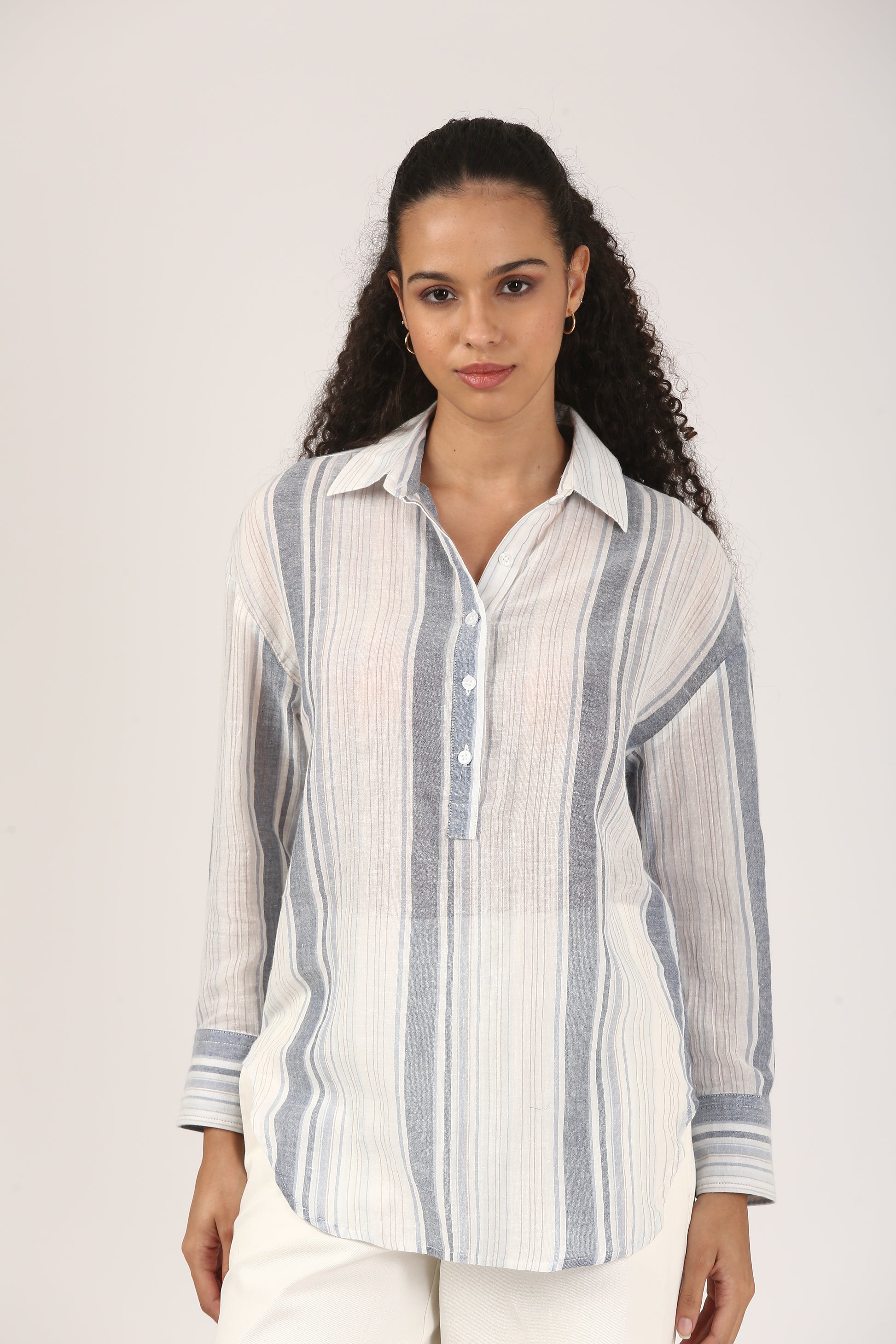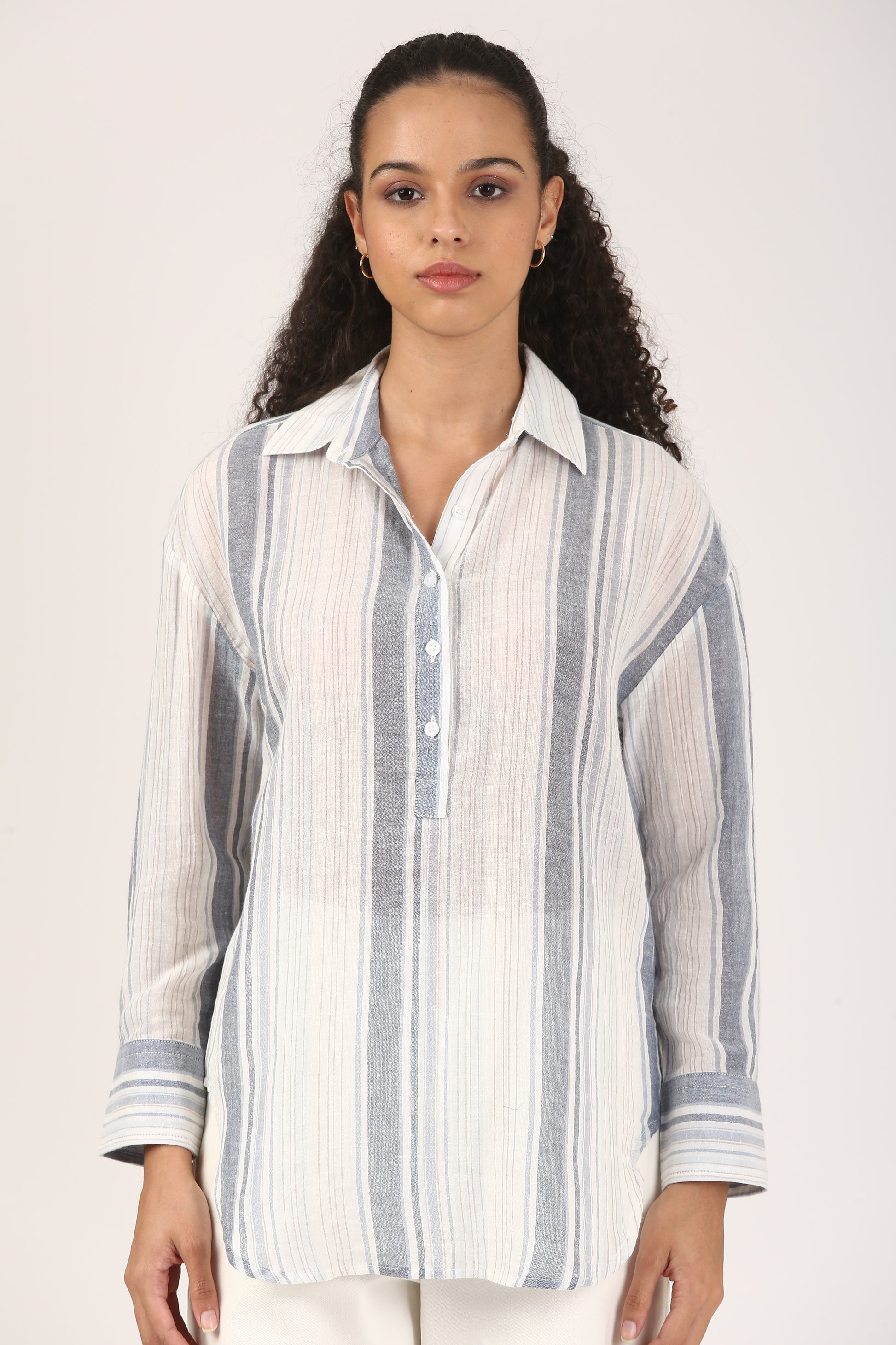 Woven in premium cotton from Erode, the Stripe Popover Shirt is designed with a half-button placket and relaxed silhouette that balances heritage with modern ease. The vertical stripes add quiet definition, while the breathable cotton keeps it effortlessly wearable through the week and beyond.