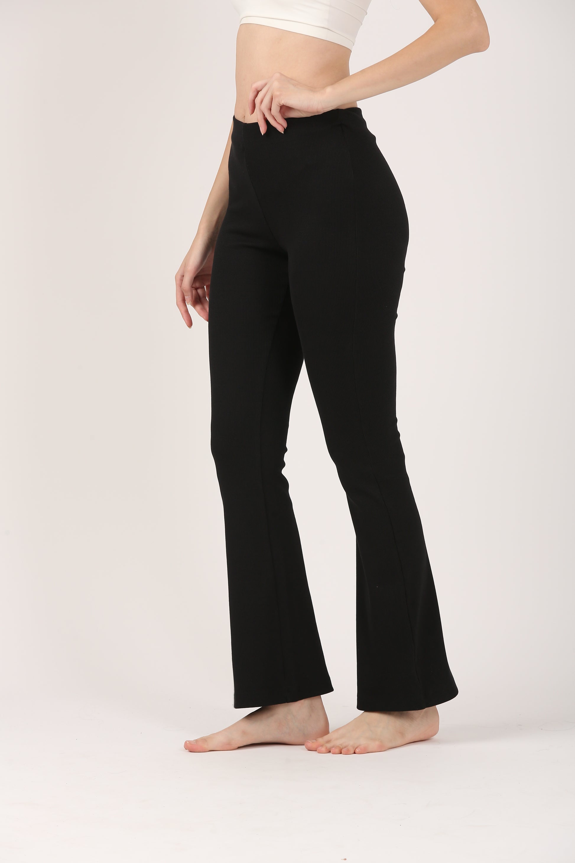 The Soft Cotton Rib Black Flare Pants are crafted for comfort, versatility, and a sleek modern silhouette. Developed from our in-house 96% cotton, 4% spandex 2x1 rib (280 GSM), these pants combine the breathability of cotton with the perfect stretch. Compacted yarns ensure durability and resilience, while the double bio + silicon wash creates our signature gold finish — giving the fabric a refined sheen, brightness, and luxurious softness.