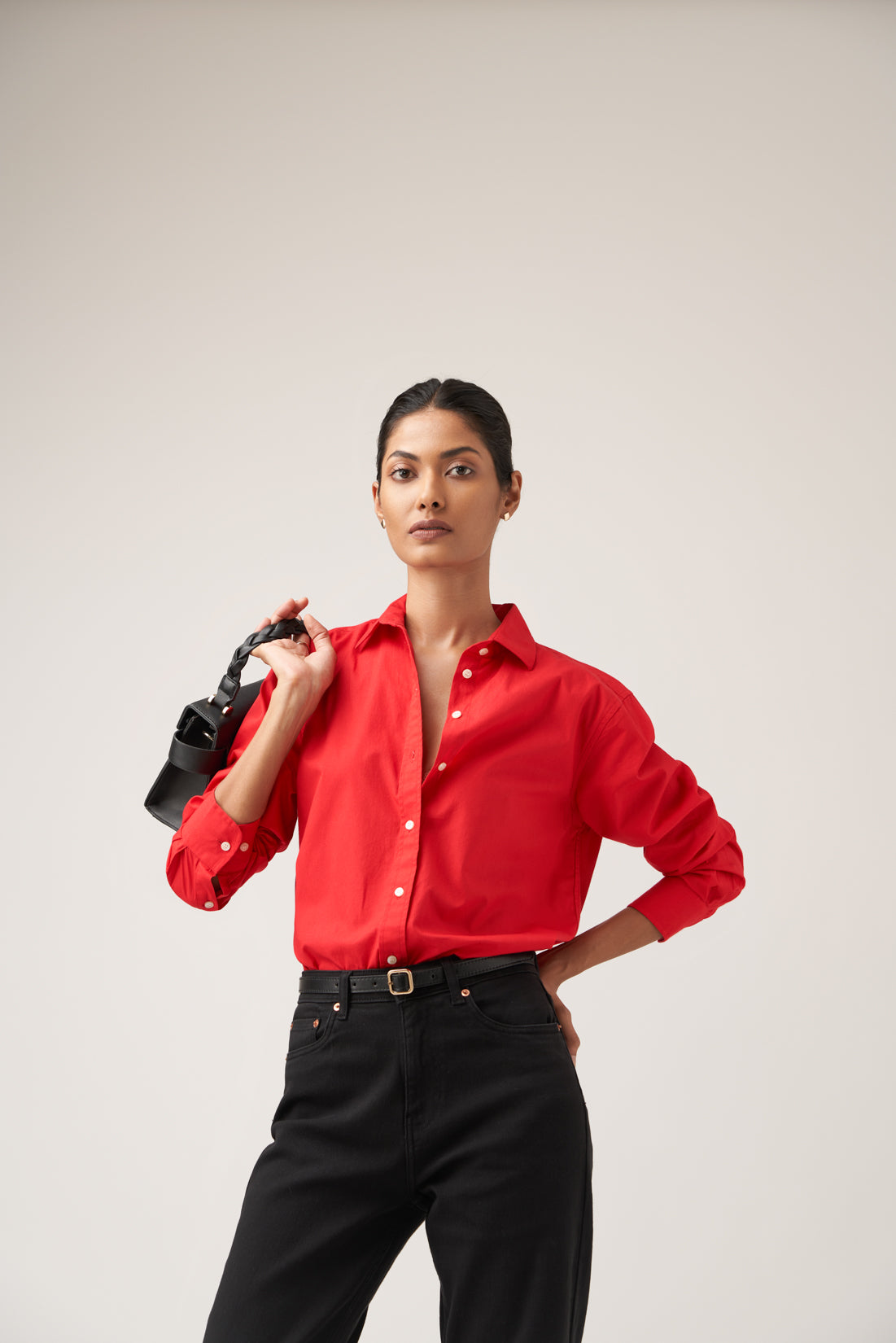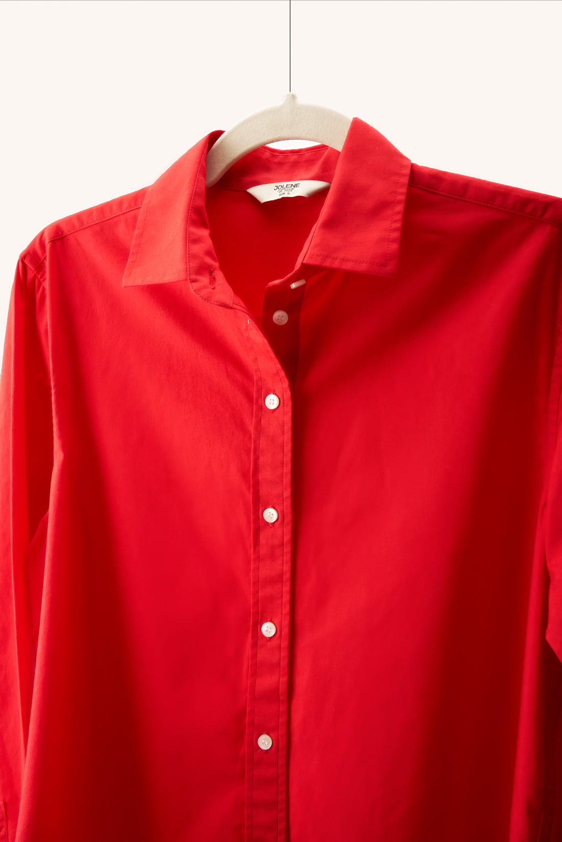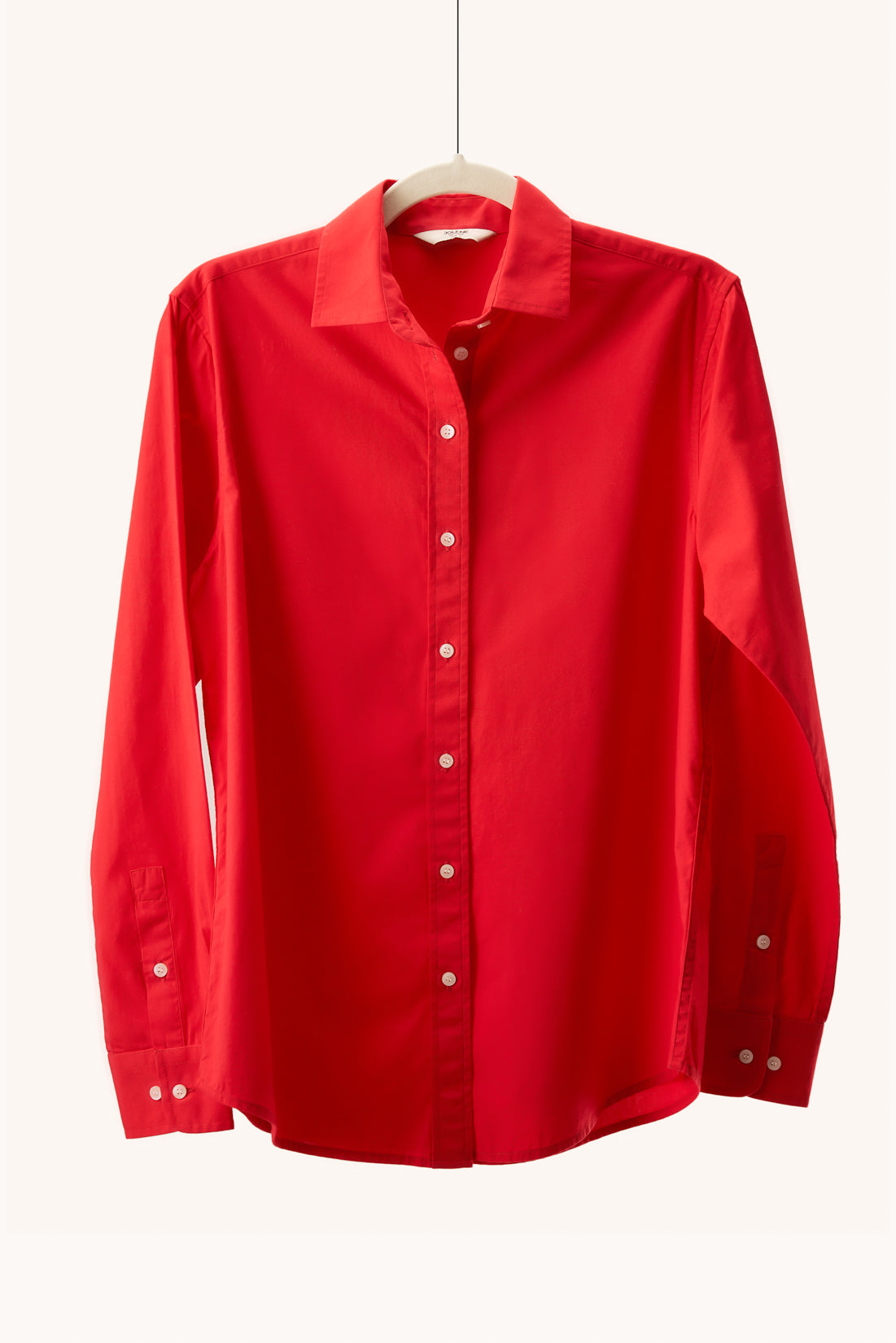 A scarlet poplin shirt that seamlessly fuses ageless style with the season’s runway red.