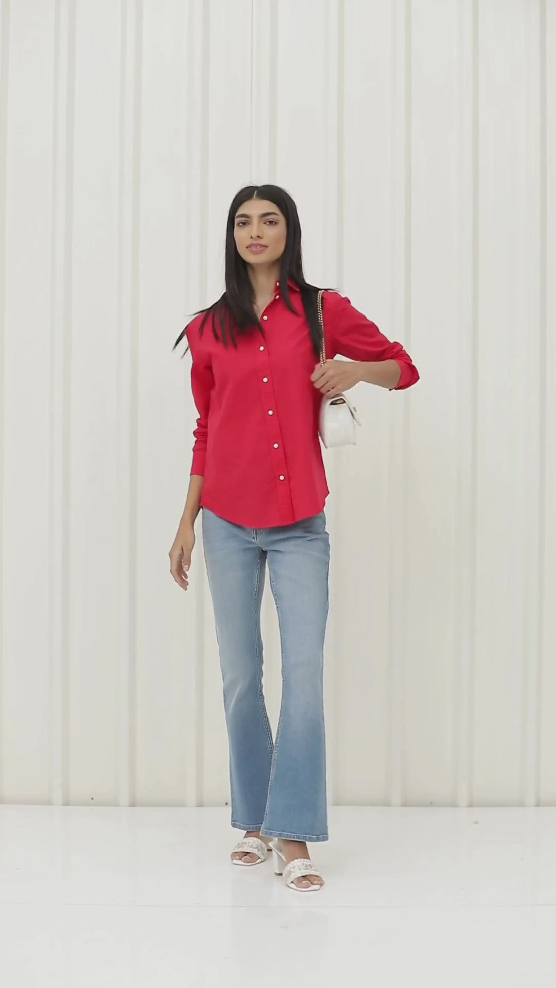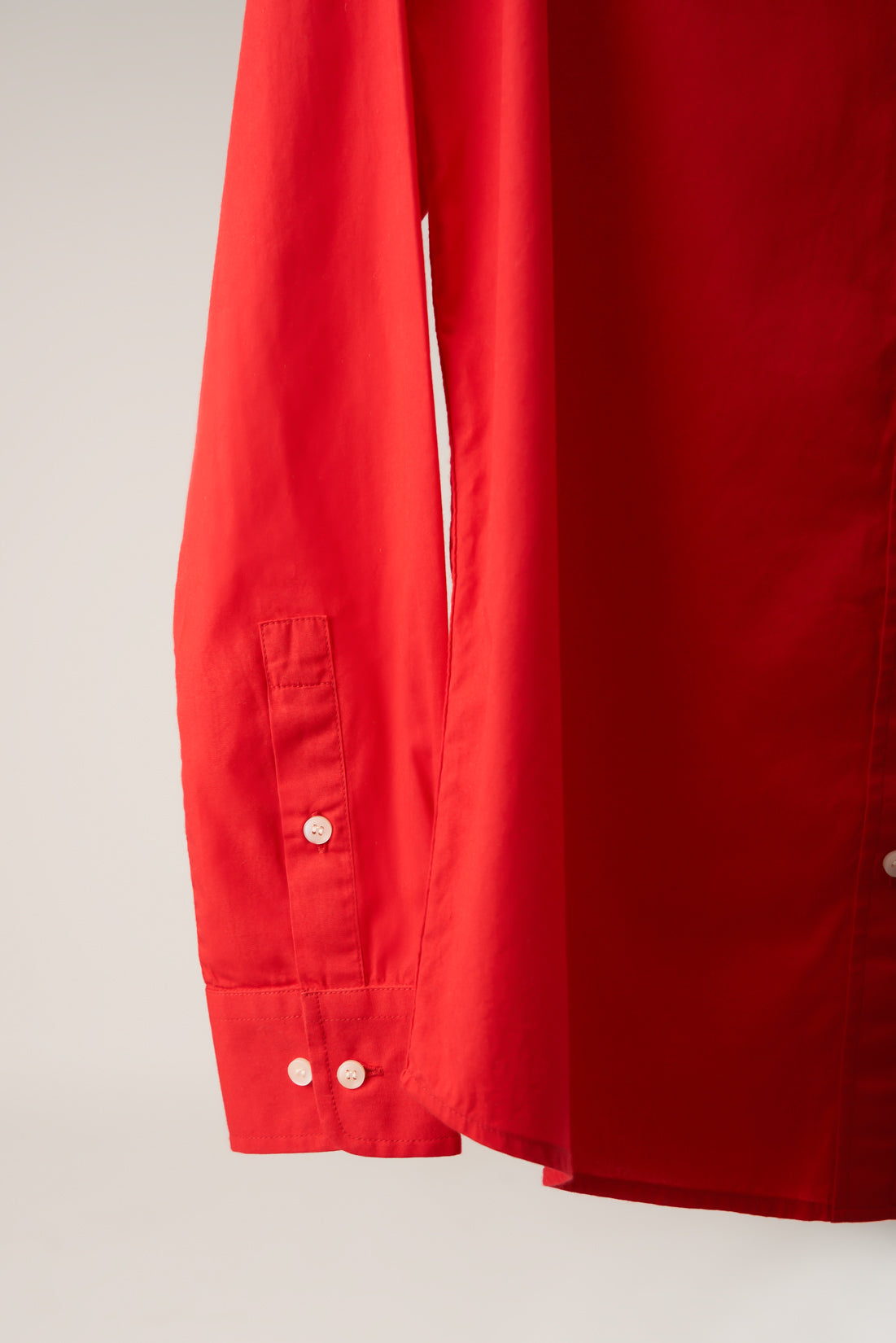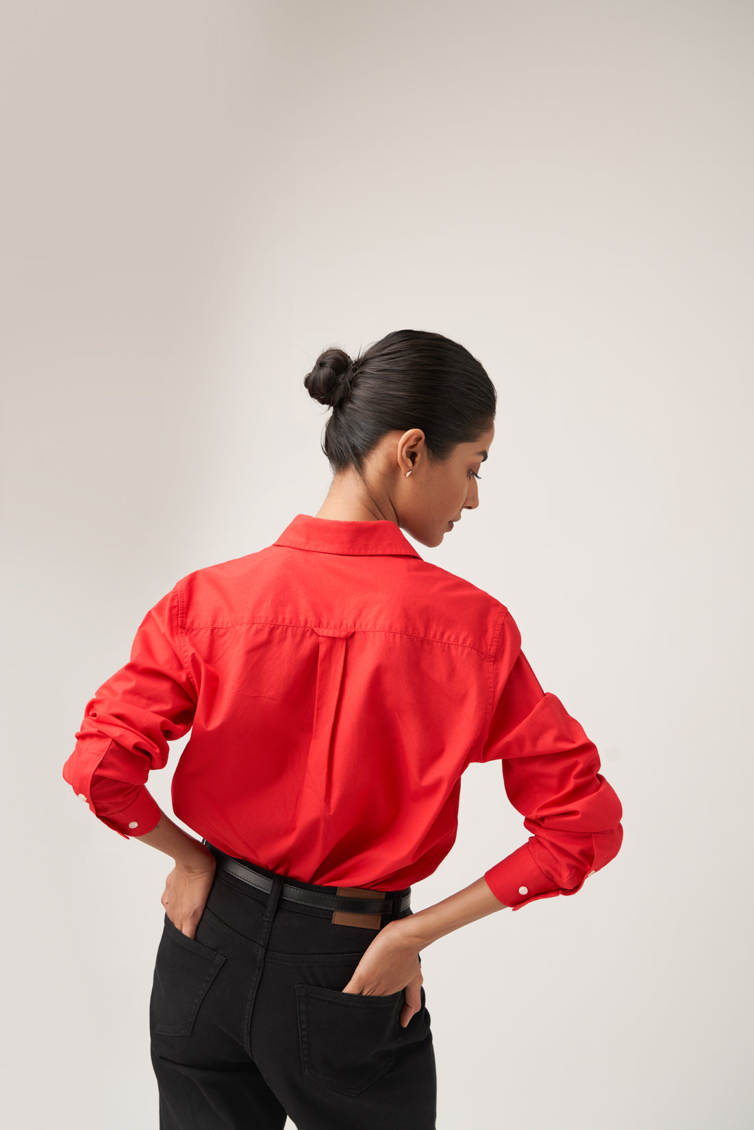 A scarlet poplin shirt that seamlessly fuses ageless style with the season’s runway red.