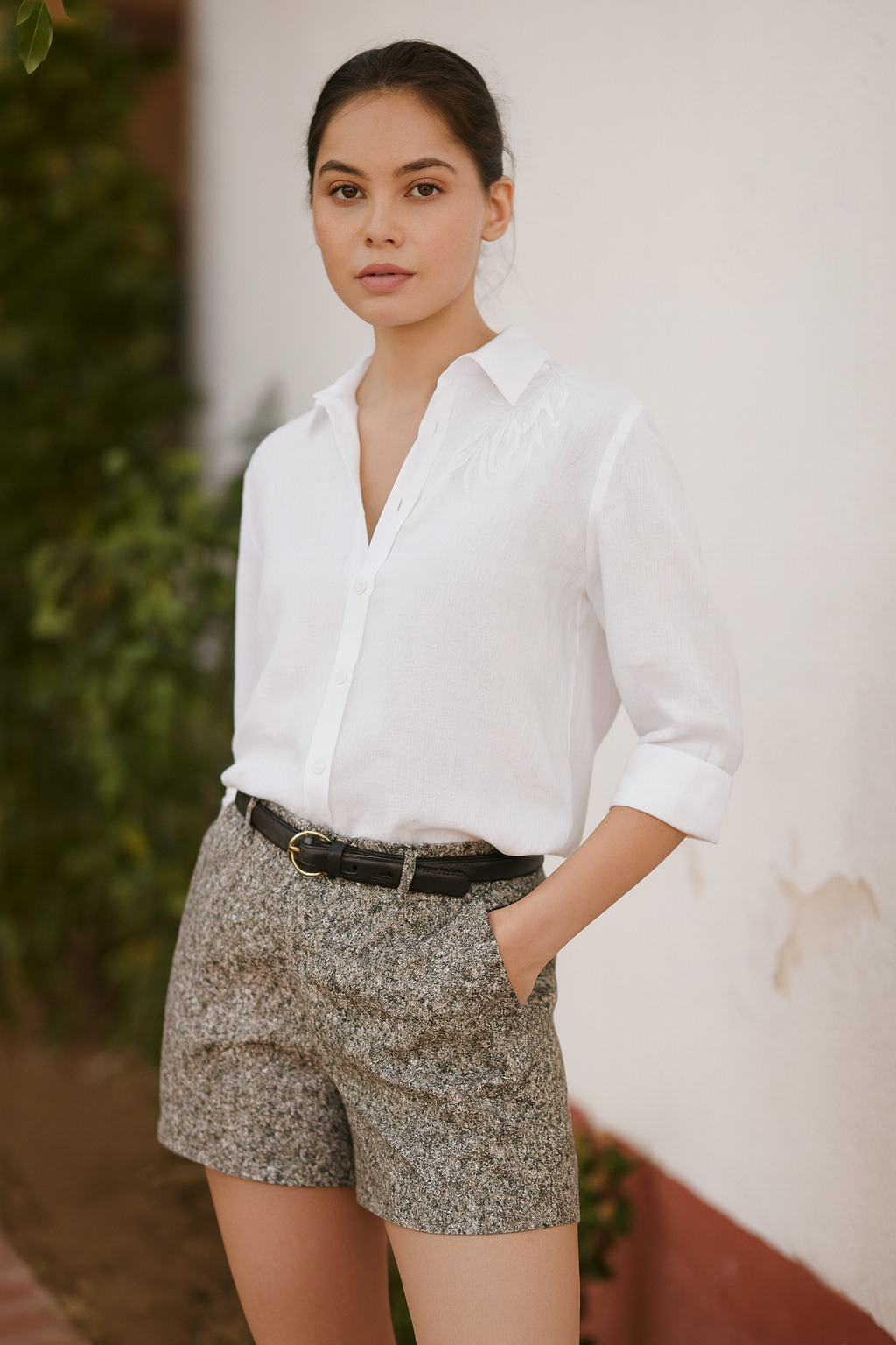 Crafted in breathable linen, this shirt combines timeless ease with delicate detailing. Designed in a relaxed fit, it features soft shoulder embroidery for a subtle touch of elegance. The collared button-down style and curved hem make it versatile enough for work, casual outings, or summer evenings, while the natural absorbency of linen ensures cool comfort all day long.